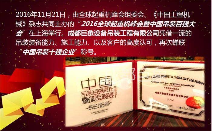 您的位置:首頁>新聞動態>熱烈祝賀成都巨象設備吊裝工程有限公司2016年蟬聯“中國吊裝十強企業”